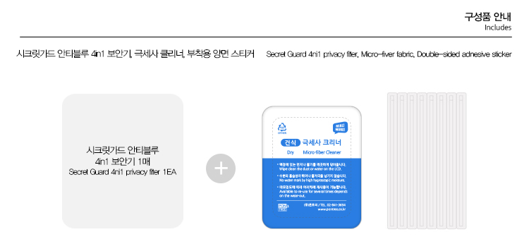 보안필름, 극세사클리너, 부착용 앙면 스티커로 구성품은 간단합니다.