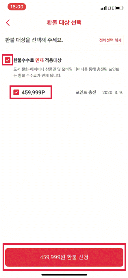 계좌로 환불 선택 > 내 계좌 확인 및 환불 신청 선택 > 환불 대상 체크 및 459,999원 환불 신청 > 환불 선택 > 확인