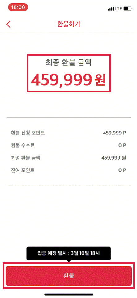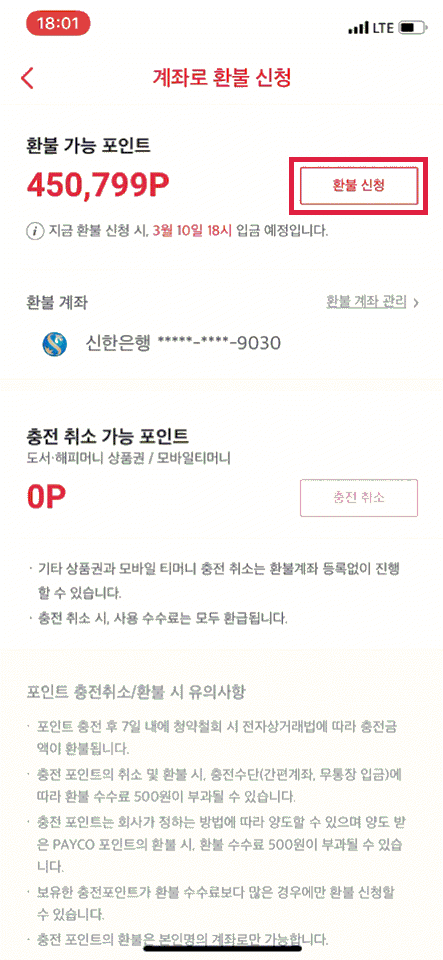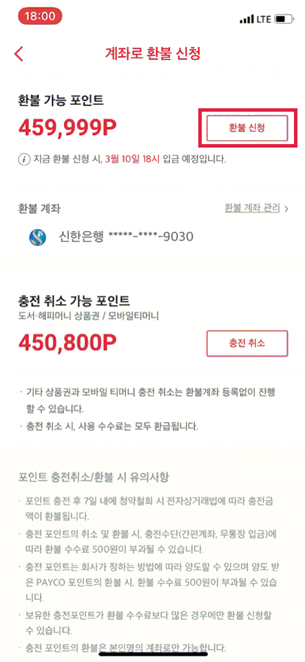 포인트 전환(1P)을 해야만 계좌로 환불 신청 가능함