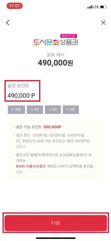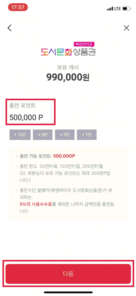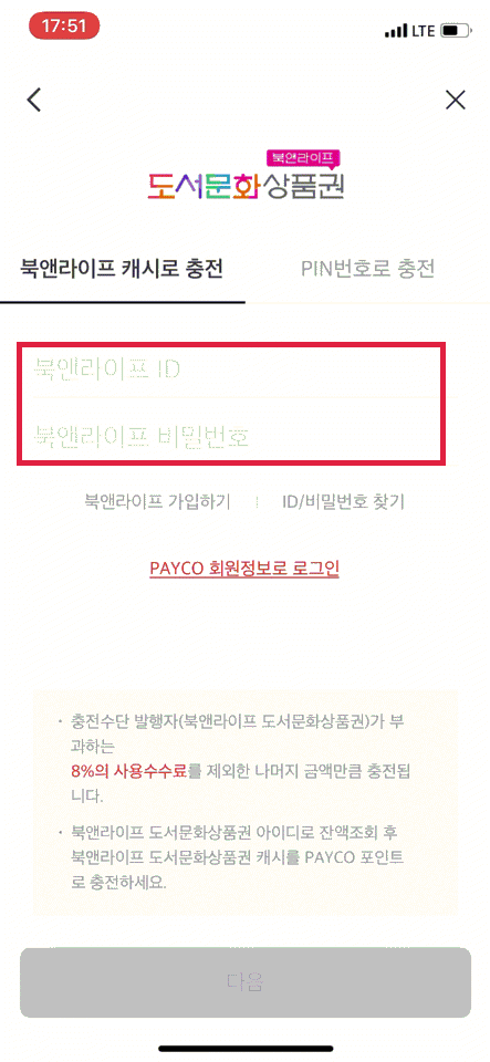 PAYCO 앱 실행 > 하단 더보기 > Point 선택 > 즉시 충전 선택 > 북앤라이프도서문화상품권 선택 > 북앤라이프 계정 로그인 > 충전 포인트 50만 입력(8% 수수료) > 충전 선택