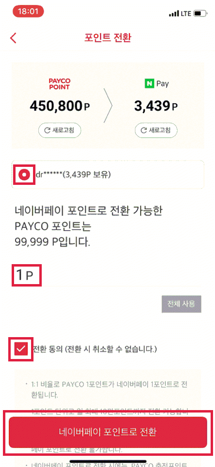 450,800P 중 1P 포인트 전환
