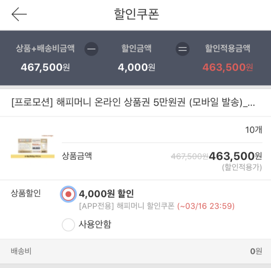 1) 쿠폰 적용하여 5만원권 10장 구입