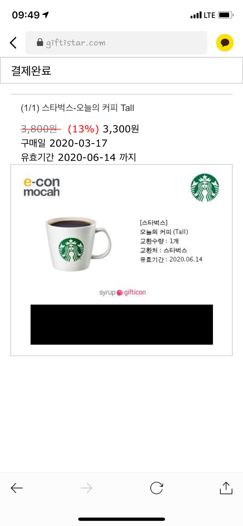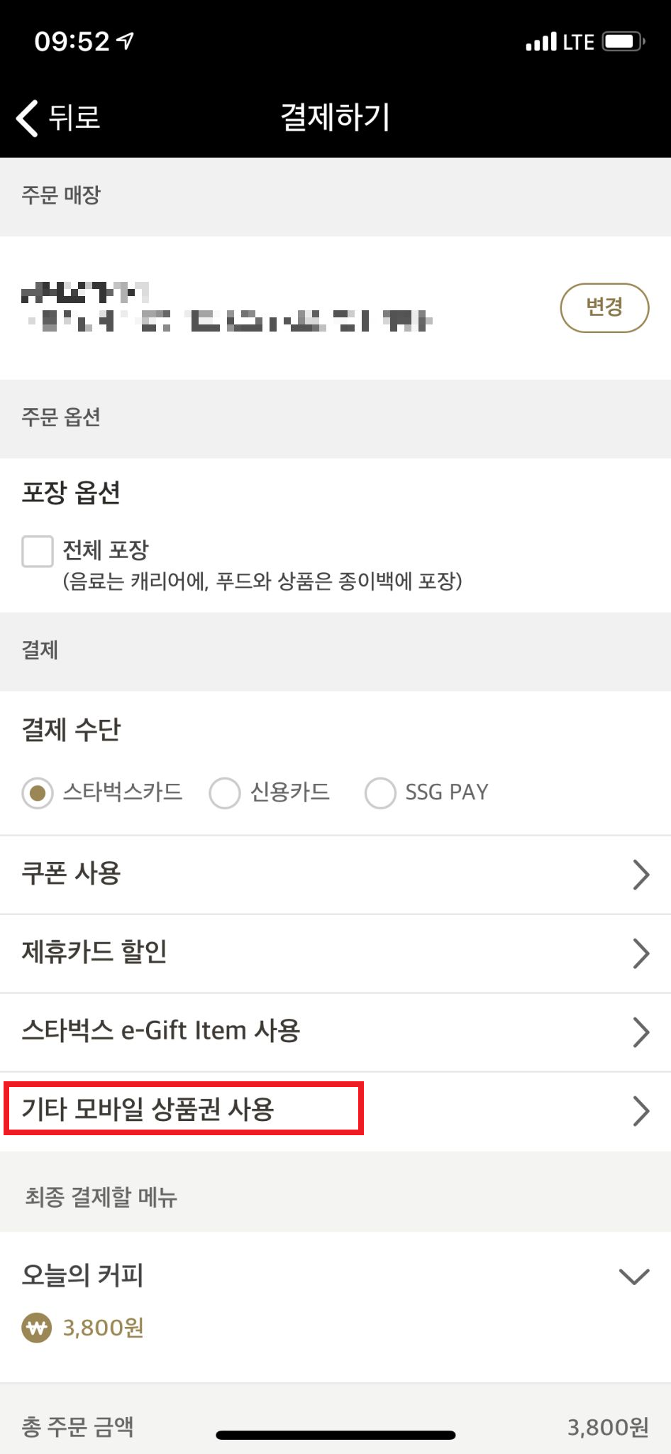 - 스타벅스 앱 실행 > 사이렌 오더 > 오늘의 커피 Tall 선택 > 바로 주문하기 > 결제 수단(기타 모바일 상품권 사용) > 상품권 가져오기 (사진첩의 사진 선택) > 모바일 상품권 사용금액 확인(-3,800) > 결제 및 주문하기