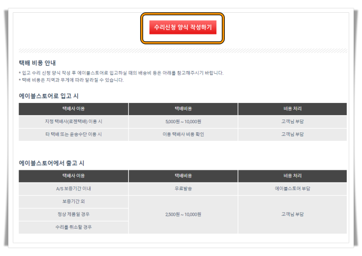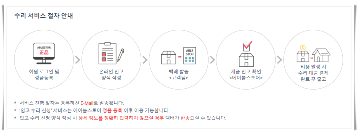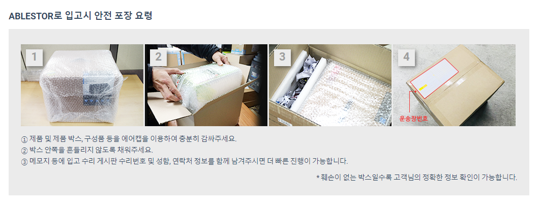 A/S 처리할 제품을 에이블스토어에 작성된 안전 포장 방법으로 지정택배사를 통해 입고 시킵니다.
