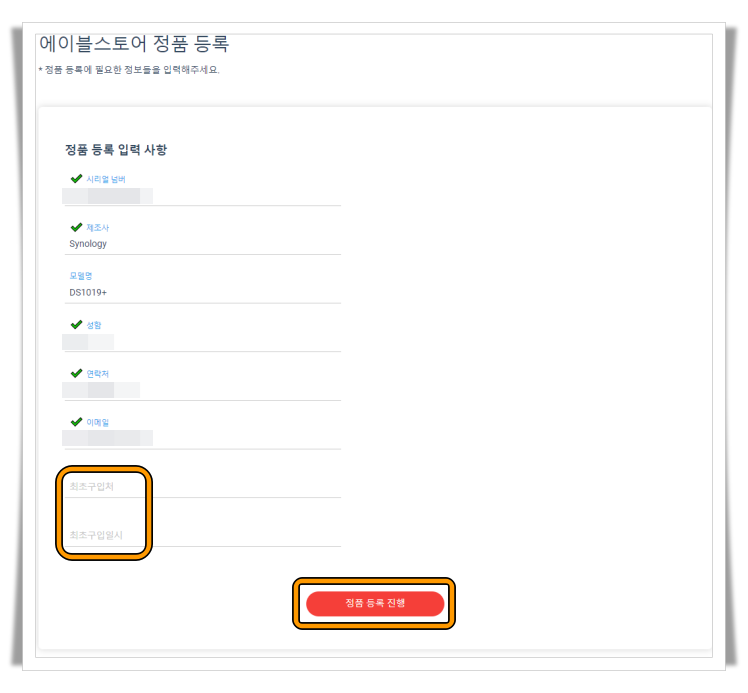 정상 시리얼넘버인 경우 아래와 같이 확인되며 구입처 및 구입일시 추가 작성 후 정품 등록 진행합니다. 등록이 완료되면 이전페이지의 나의 정품 기기 목록에 표기됩니다.