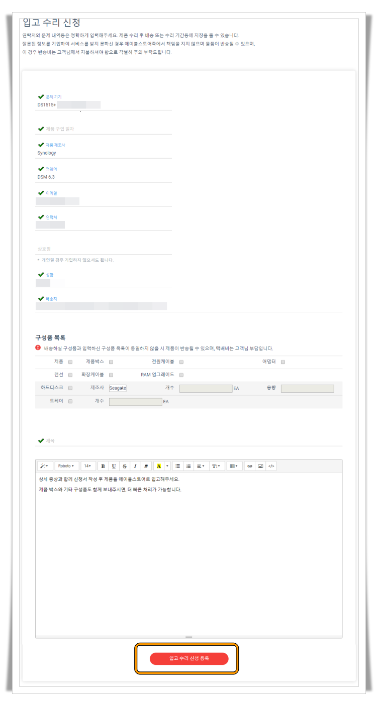 로그인하였기 때문에 사용자 정보는 그대로 가져오며, 초록색 체크 표기중 누락 부분만 추가로 작성해주시면 됩니다. 이후 상세 증상 작성 후 입고 수리 신청 등록 선택하여 온라인 입고를 진행합니다.