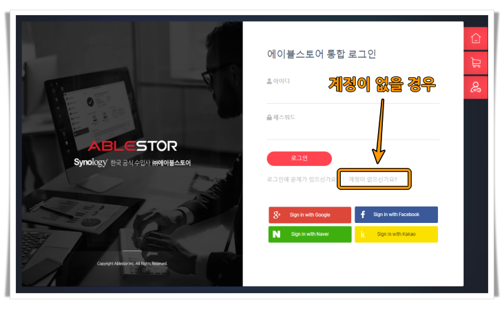에이블스토어 로그인 페이지(https://www.ablestor.com/member/login)에서 로그인 하거나 계정이 없는 경우 회원가입하시기 바랍니다.