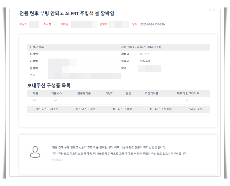 이번 포스팅에서는 사용중인 DS1515+가 사망하게되어 시놀로지 A/S 처리 과정에 대해 알려드리겠습니다. 결론을 사망한 DS1515+ 메인보드 교체 비용보다 새롭게 구매하는 비용이 더 저렴하다고 판단되어 DS1019+ 제품을 구매하였습니다.