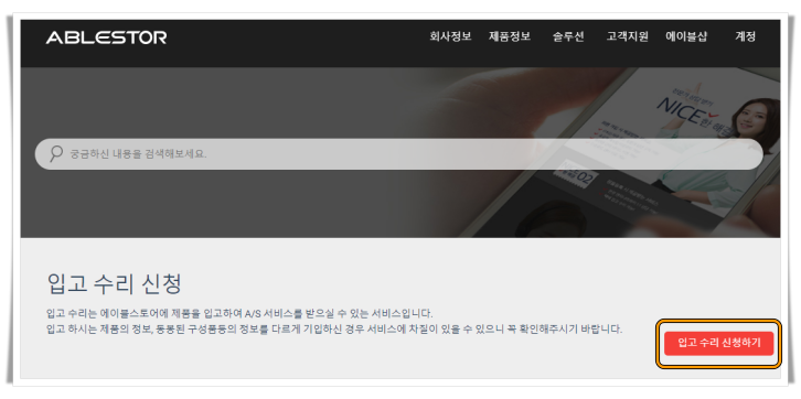 고객지원 > 입고 수리 신청 페이지 하단 > 수리신청 양식 작성하기 > 입고 수리 신청하기 선택