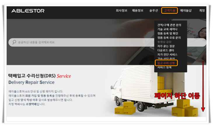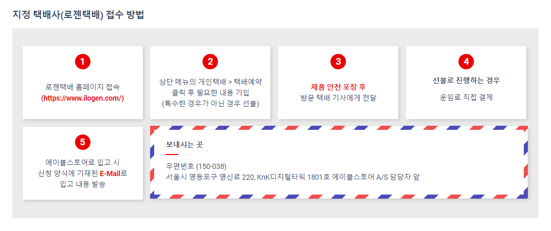 A/S 처리할 제품을 에이블스토어에 작성된 안전 포장 방법으로 지정택배사를 통해 입고 시킵니다.