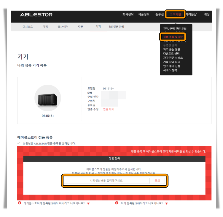 로그인 > 고객지원 > 정품 등록 및 확인 페이지 하단의 정품 등록에 시리얼넘버를 입력 후 조회 선택합니다.