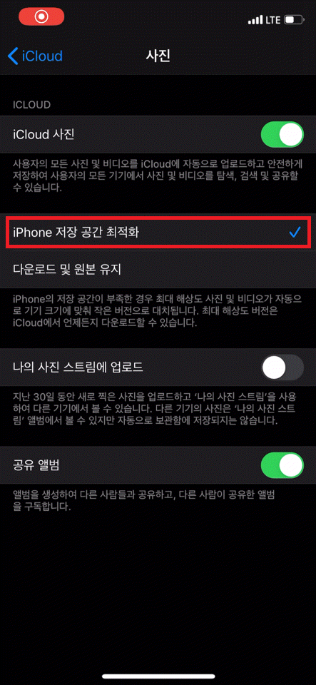 iPhone 저장 공간 최적화는 iCloud로 사진을 업로드하는 사용자만 해당됩니다. iPhone 저장 공간 최적화 설정을 켜 두면 원본은 iCloud에 저장되기 때문에 iPhone저장 공간을 절약할 수 있습니다.