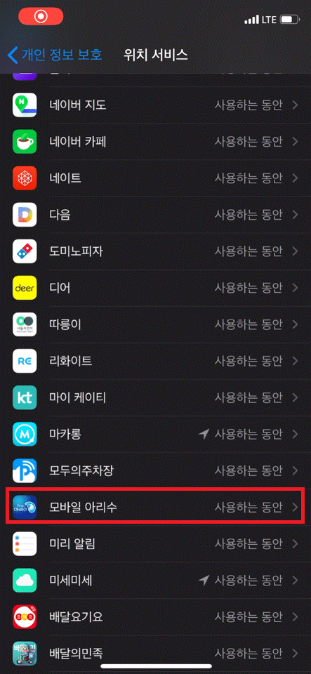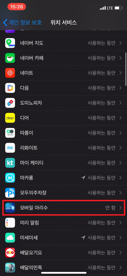 - 설정 방법 : 설정 > 개인 정보 보호 > 위치 서비스 > 앱(예: 모바일 아리수) > 위치 접근 허용 > 안 함