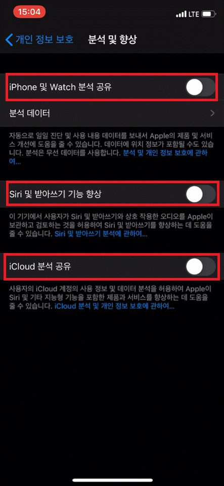 - 설정 방법 : 설정 > 개인 정보 보호 > 분석 및 향상 > 모든 설정 끔