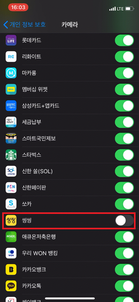 - 카메라 설정 방법 : 설정 > 개인 정보 보호 > 카메라 > 앱 > 끔
