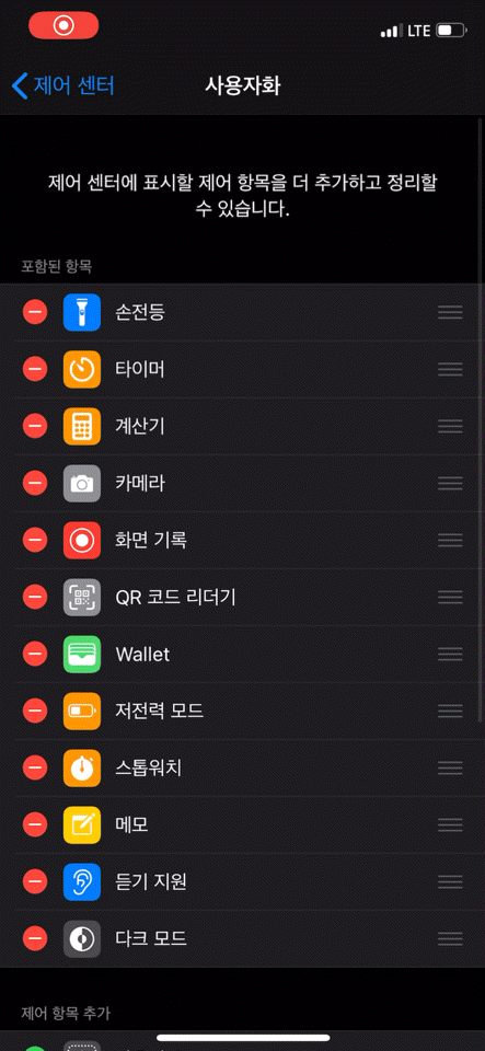 - 설정 방법 : 설정 > 제어 센터 > 제어 항목 사용자 > "+" 항목 추가 or "-" 항목 제거