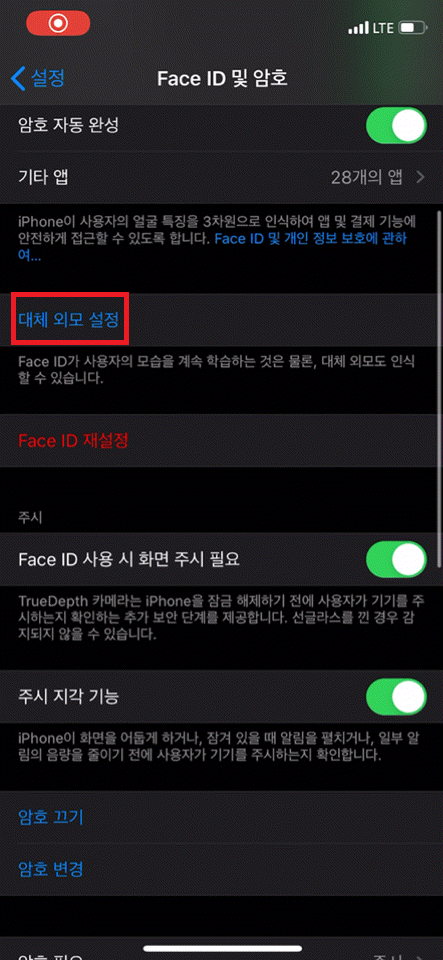 - 설정 방법 : 설정 > Face ID 및 암호 > 대체 외모 설정