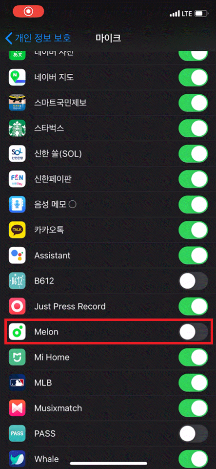 - 마이크 설정 방법 : 설정 > 개인 정보 보호 > 마이크 > 앱 > 끔