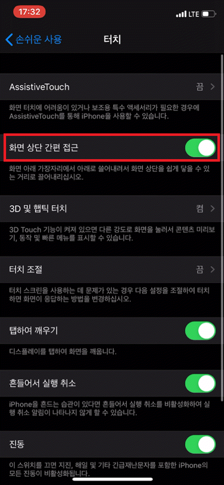 - 설정 방법 : 설정 > 손쉬운 사용 > 터치 > 화면 상단 간편 접근 > 켬
