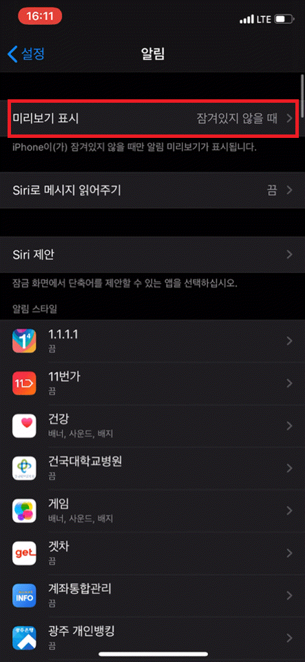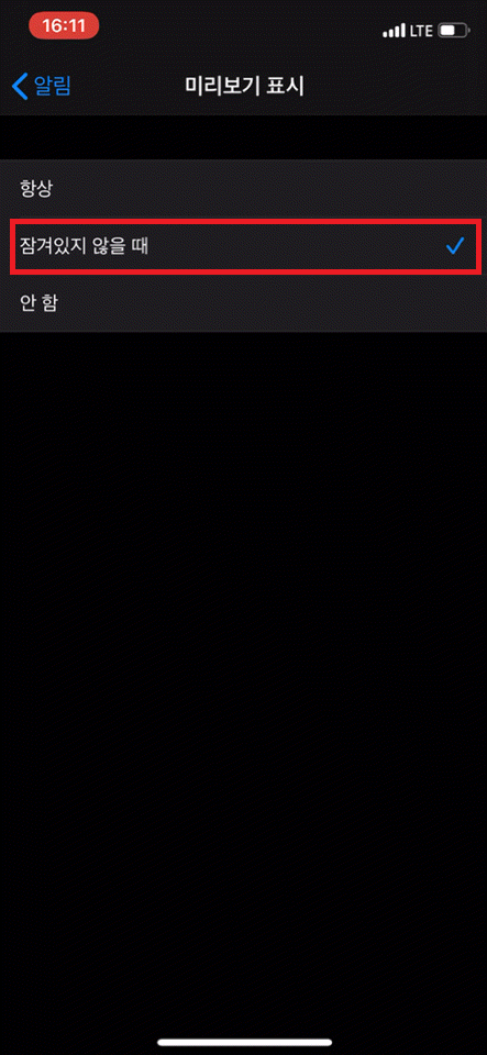 - 설정 방법 : 설정 > 알림 > 미리보기 표시 >잠겨있지 않을 때