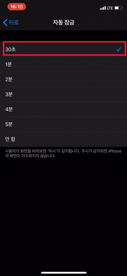 - 설정 방법 : 설정 > 디스플레이 및 밝기 > 자동 잠금 > 시간 설정