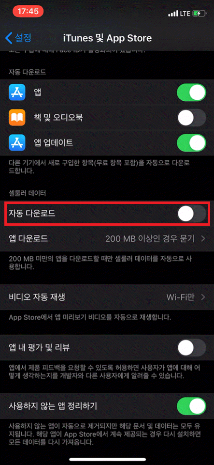 - 자동 다운로드 비활성 설정 방법 : 설정 > iTunes 및 App Store 설정 > 셀룰러 데이터 > 자동 다운로드 > 끔