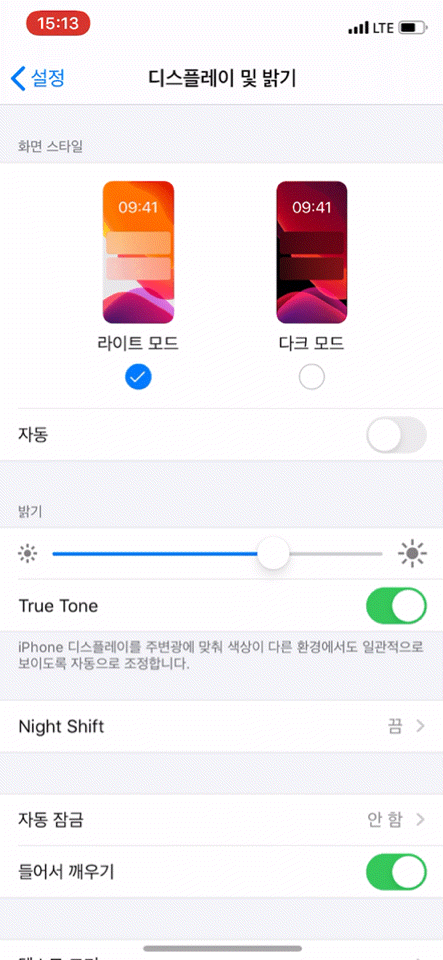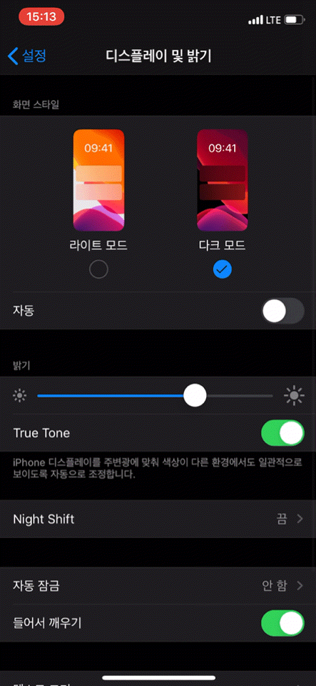 - 설정 방법 : 설정 > 디스플레이 및 밝기 > 다크모드