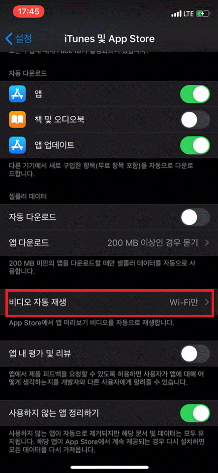 - 비디오 자동 재생 비활성 설정 방법 : 설정 > iTunes 및 App Store 설정 > 비디오 자동 재생 > Wi-Fi만 선택