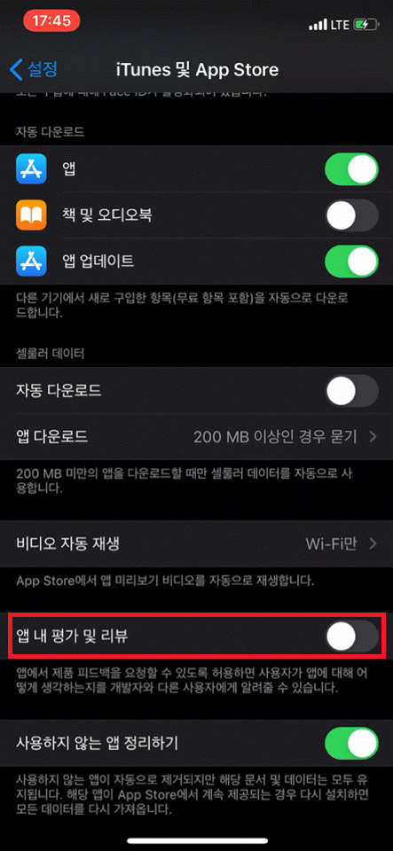 - 설정 방법 : 설정 > iTunes 및 App Store 설정 >앱 내 평가 및 리뷰 > 끔