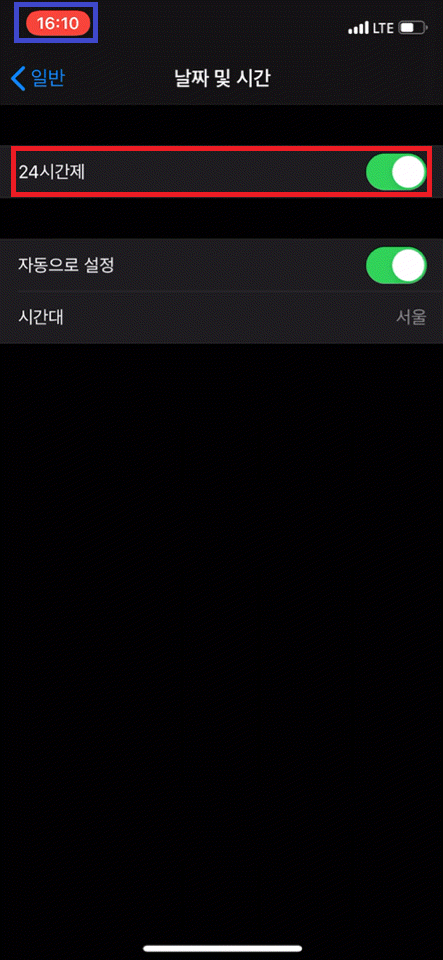 - 설정 방법 : 설정 > 일반 > 날짜 및 시간 > 시간 설정 > 24시간제 > 켜기