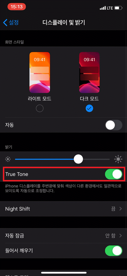 - 설정 방법 : 설정 > 디스플레이 및 밝기 > True Tone