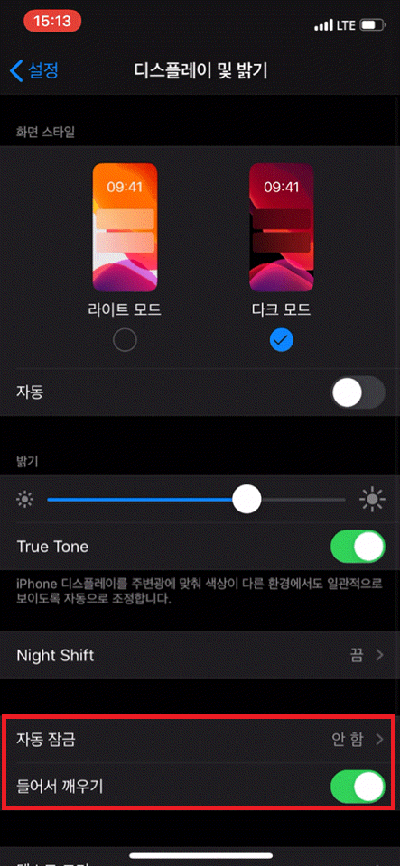 설정 > 디스플레이 및 밝기 > 자동 잠금 > 들어서 깨우기 > 켜기