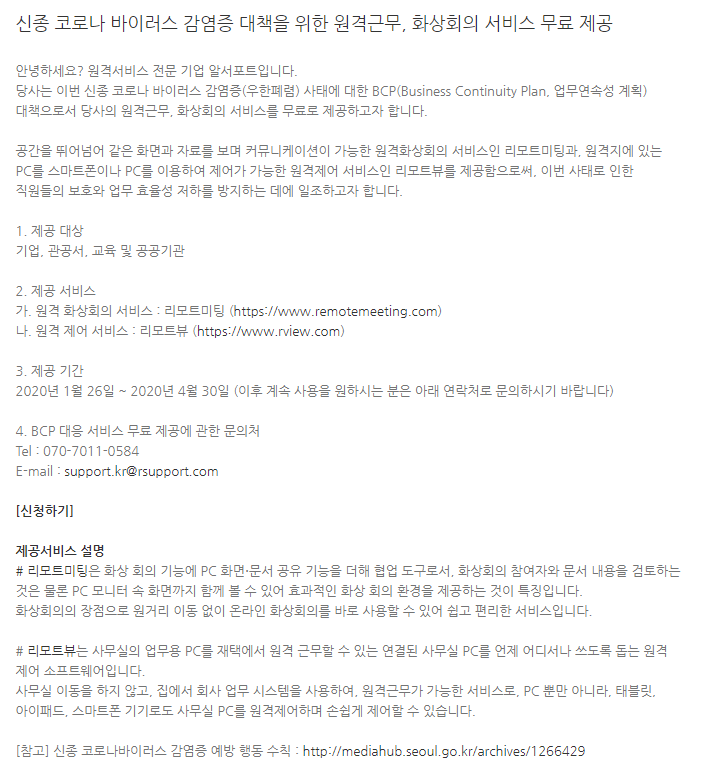 코로나 관련하여 법인 사업자 중 알서포트의 리모트뷰, 리모트미팅 미 도입 기업에 한정하여 2020년 4월 30일 (목)까지 무상 제공 한다고 하니 관심있는 기업 담당자분께서는 확인해 보시기 바랍니다.