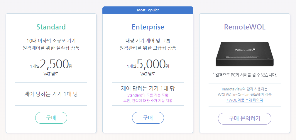 개인 사용자로 비용적 측면에서 장점은 연 27,500원(원격지 1대)으로 편리하게 원격제어가 가능합니다. 단점은 원격지 장비 기준으로 비용을 책정하다보니 개인 사용자라 하더라도 회사PC→집PC, 집PC→회사PC 원격제어하기 위해서는 2대 라이선스 구입 비용이 필요합니다.