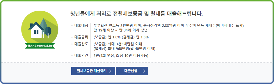 청년전용 보증부월세 대출 : 부부합산 연소득 2천만원이하, 순자산가액 2.88억원 이하 무주택 세대주(예비세대주 포함)
