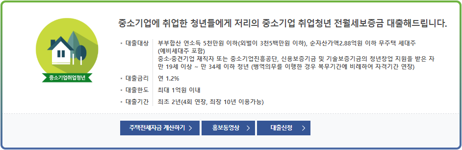 중소기업 취업청년 전월세보증 대출 : 부부합산 연소득 5천만원이하, 순자산가액 2.88억원 이하 무주택 세대주
