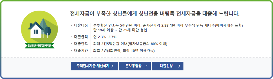 청년전용 버팀목전세자금 : 부부합산 연소득 5천만원이하, 순자산가액 2.88억원 이하 무주택 세대주