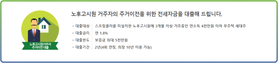노후고시원 거주자 주거이전 대출 : 스프링쿨러 미설치 고시원 3개월 거주자, 연소득 4천만원이하, 무주택 세대주
