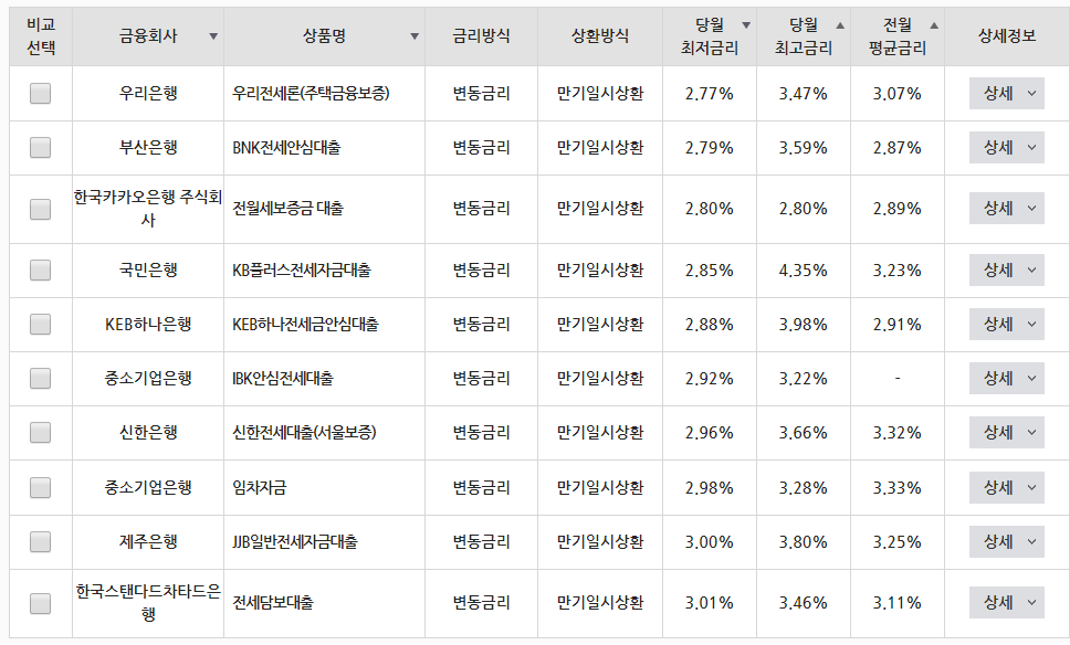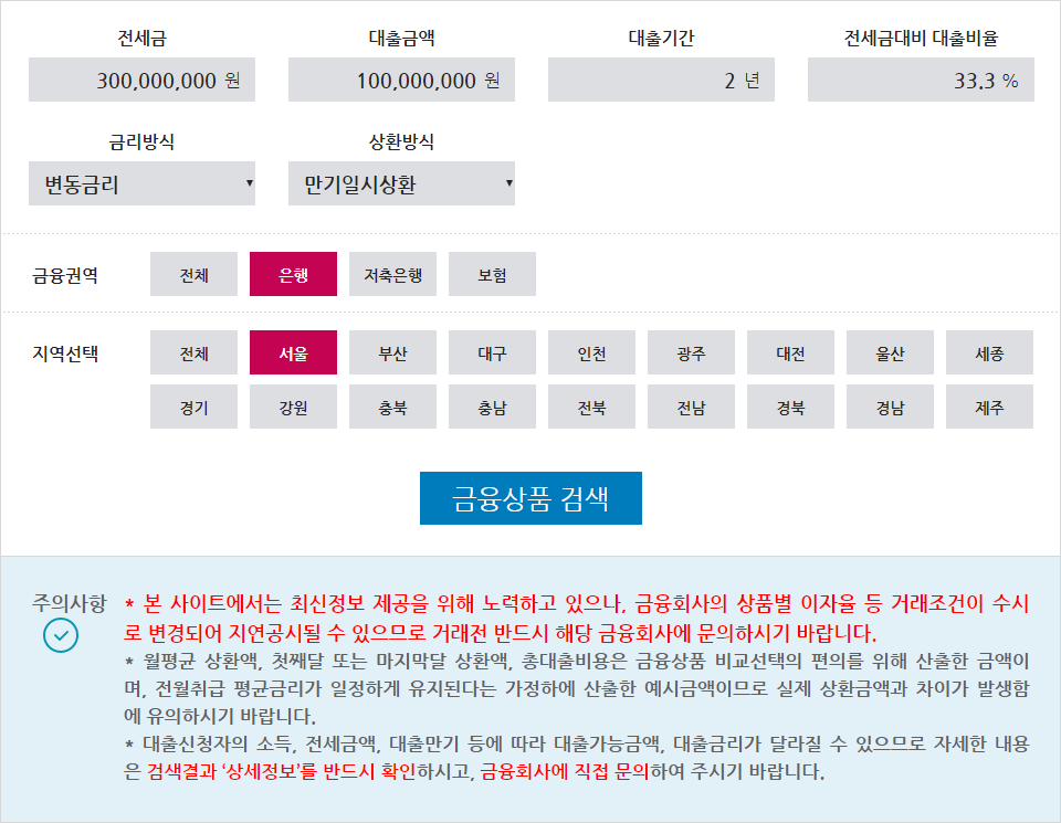 따라서 금융권 전세자금 대출을 받을실 경우에는 각 기관의 상품별 금리와 대출조건 및 우대금리를 종합적으로 고려하여 상품을 결정하시기 바랍니다.