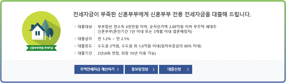 신혼부부전용 전세자금 : 부부합산 연소득 6천만원이하, 순자산가액 2.88억원 이하 무주택 세대주 신혼부부