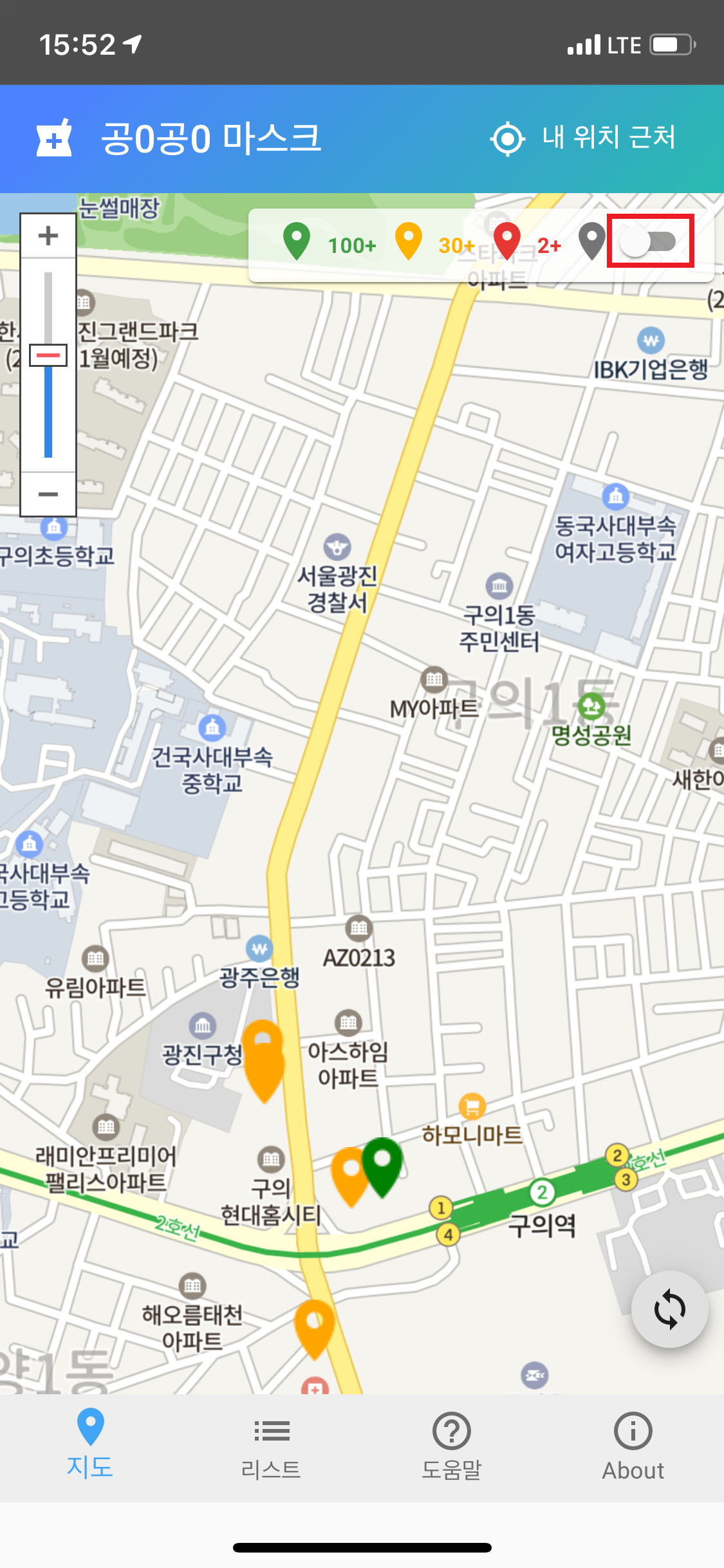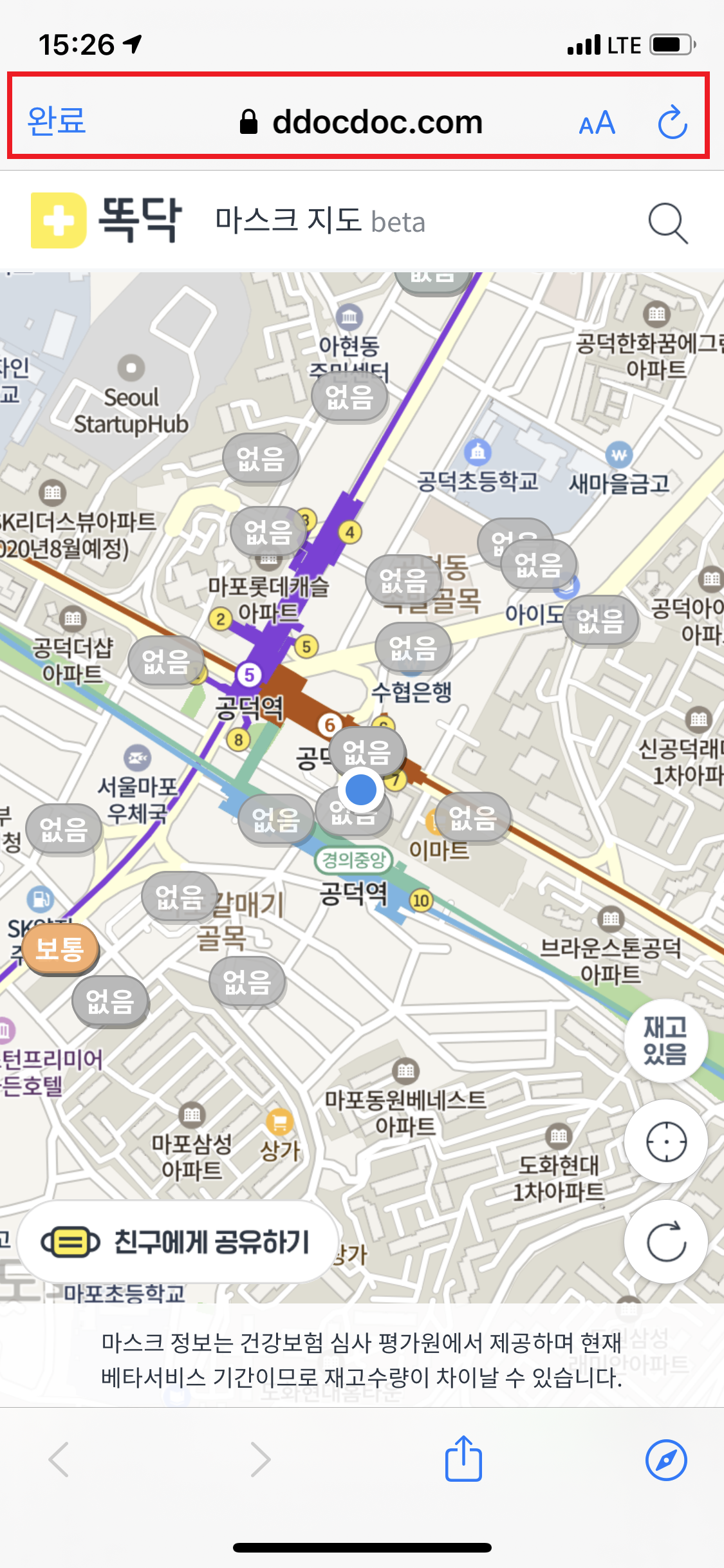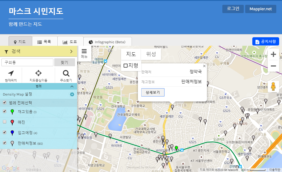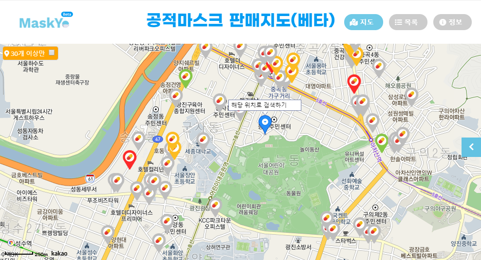 장점: 굿닥과 동일한 지도서비스로 다른 서비스들과 이질감 없음, 마스크 재고있는 약국만 확인 가능함