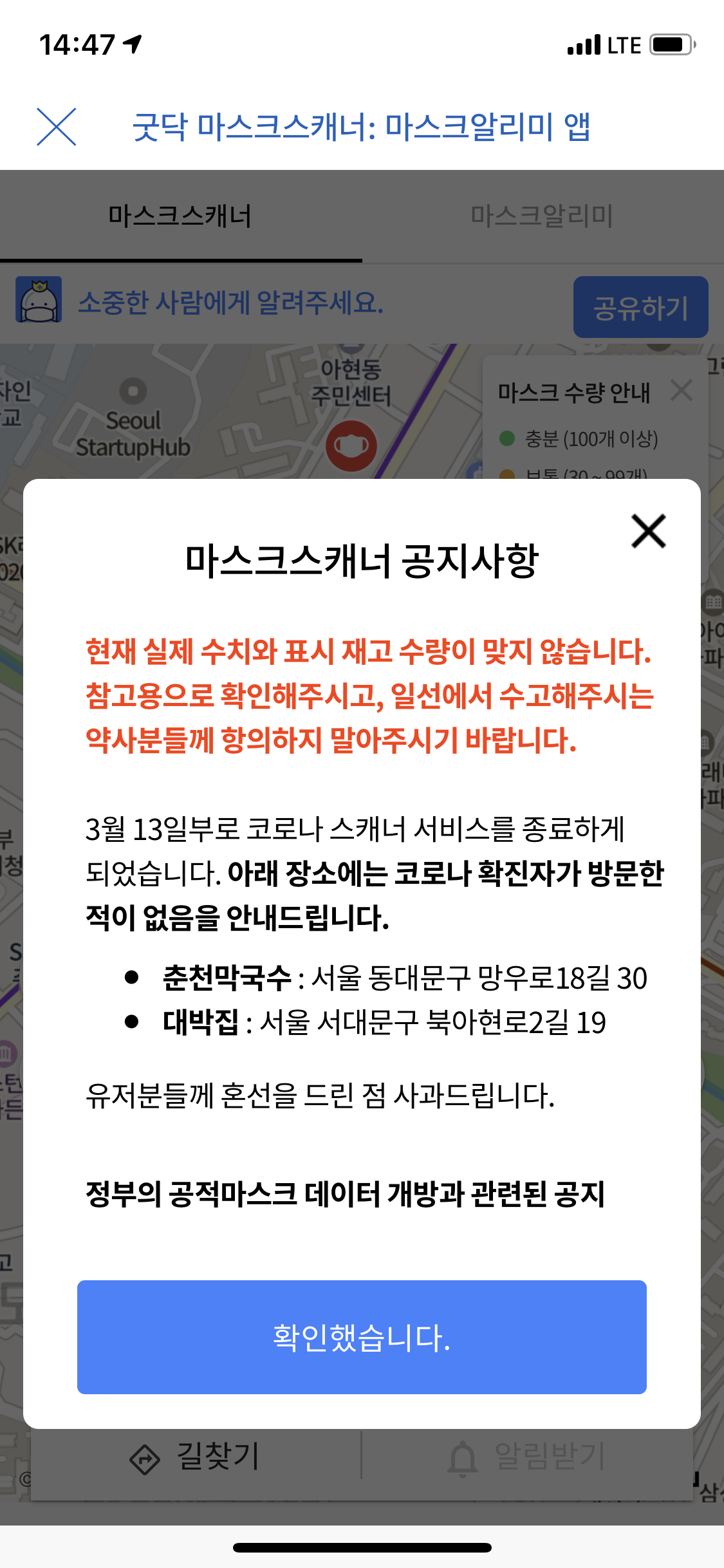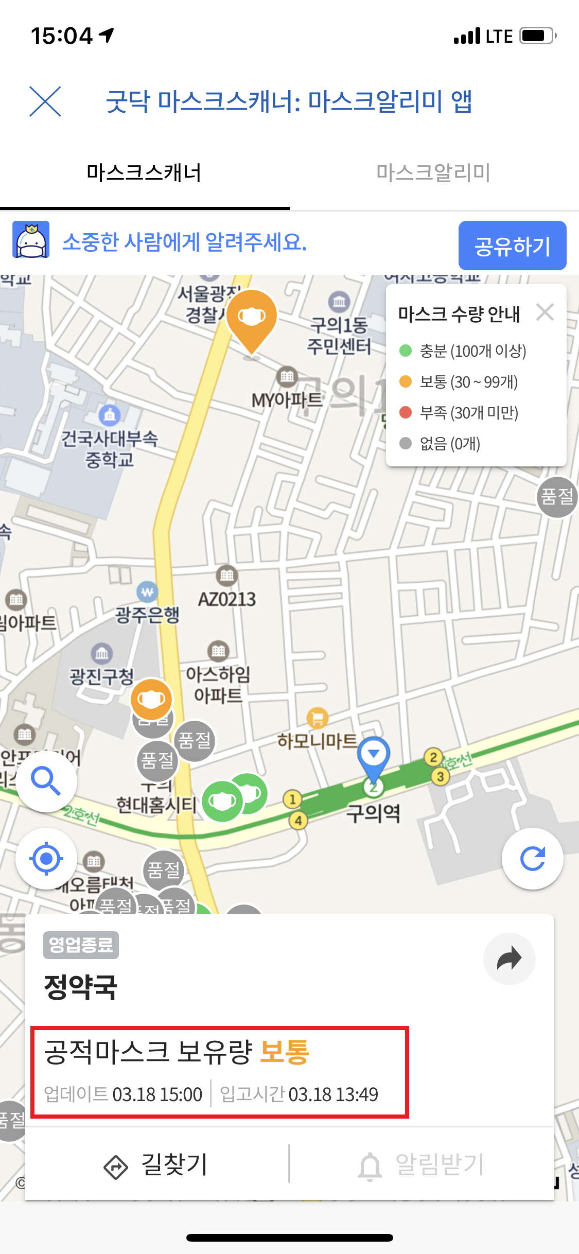 단점: 지명 검색시 약국이름 안나옴, 마스크알리미 서비스는 iOS 미지원