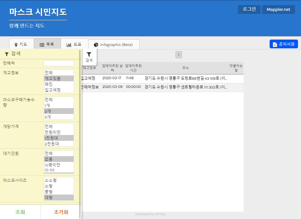 조건 : 지도 서비스 위주, 재고만 표기 가능, 쉬운 검색 서비스, 마스크 입고 및 수정 시간 표기(시:분:초)