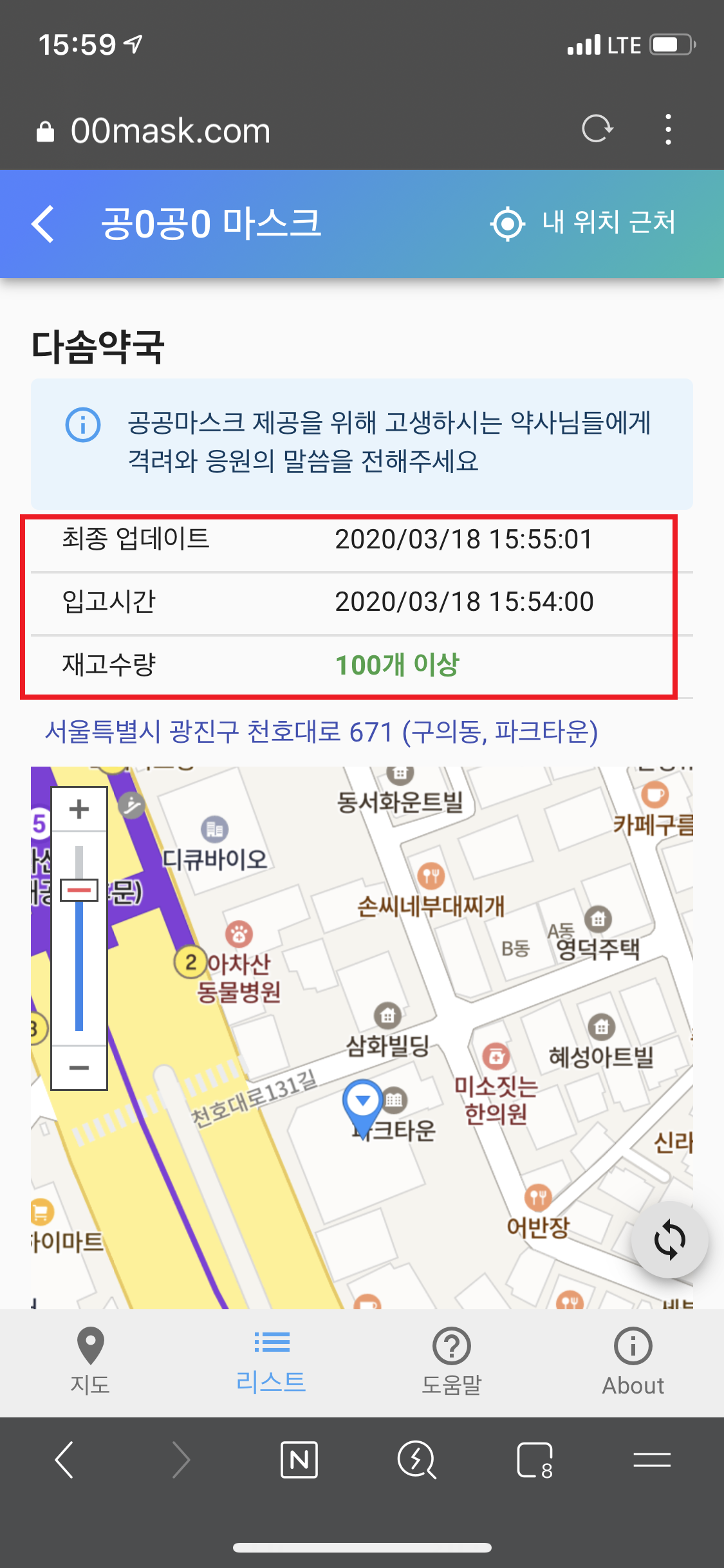 단점: 앱내 웹(브라우저)를 실행하여 서비스, 마스크 재고 업데이트 시간 미지원, 지명 검색시 약국이름 안나옴