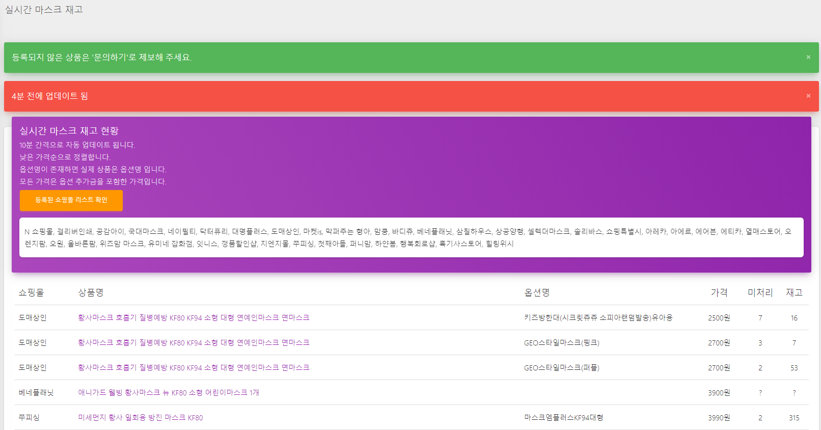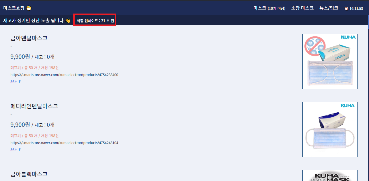 실시간 마스크 재고 사이트이며, 10분 간격으로 자동 업데이트됩니다.