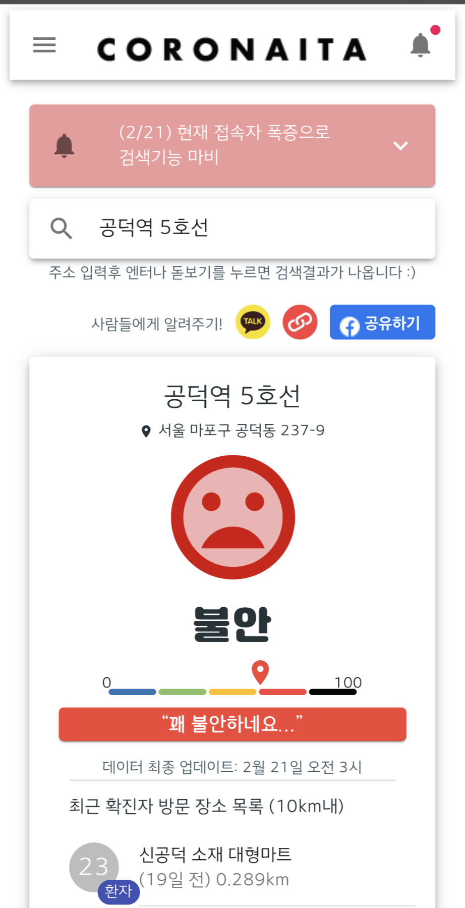 2/21 (오후 3시기준) 확진자 전일대비 52명 증가됨(총156명)으로서, 국민들의 불안이 점차 증가되고 있습니다. 이전 포스팅에서 확진자 동선 사이트 정보를 알려드렸습니다. 금일 추가로 지역명을 검색하면 위험정도를 파악하고 이모티콘으로 표시해주는 사이트가 등장하였습니다.