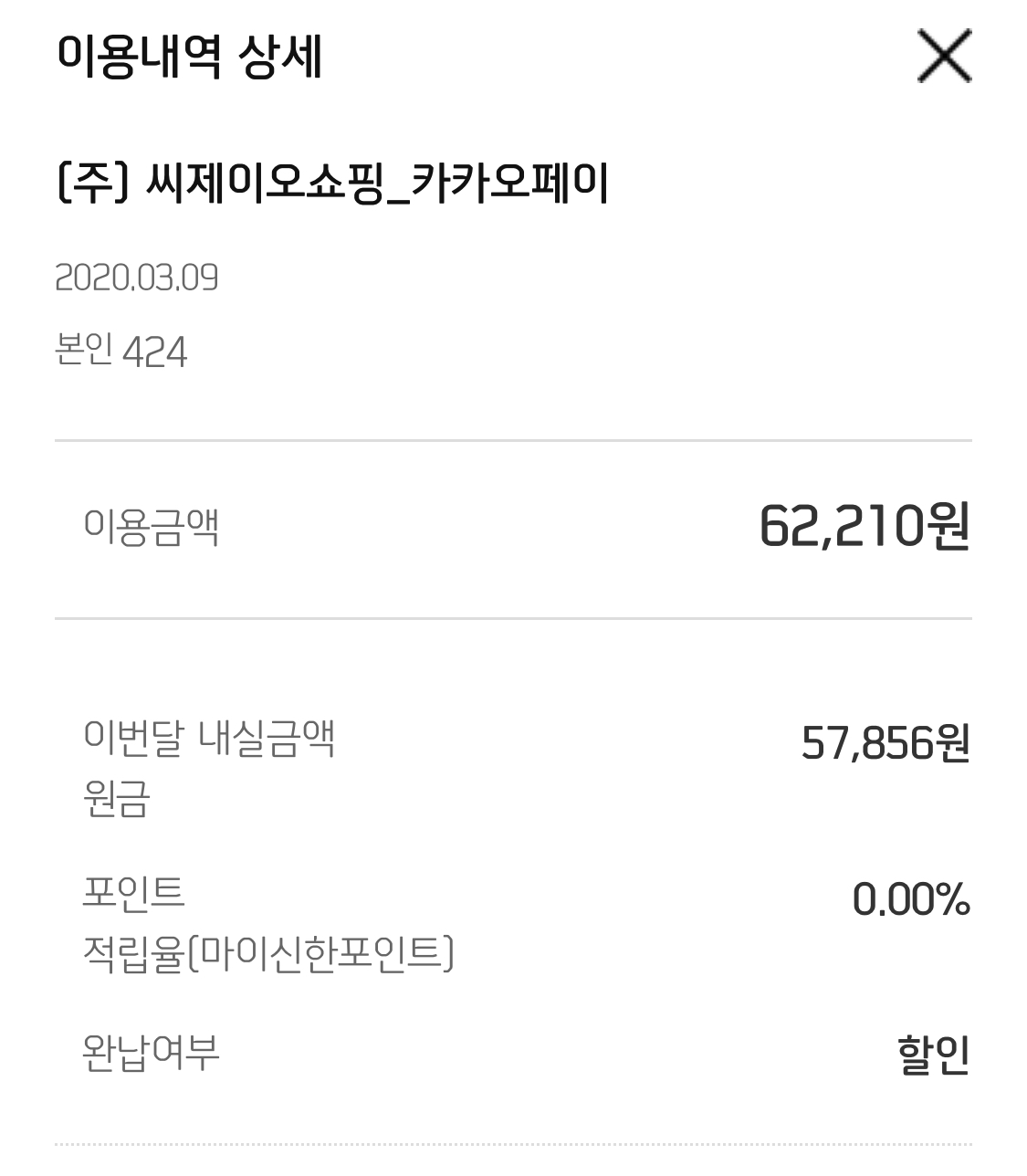 카카오페이 신한카드 결제 청구 할인(7%) 적용되어 5.7에 구매하였습니다.