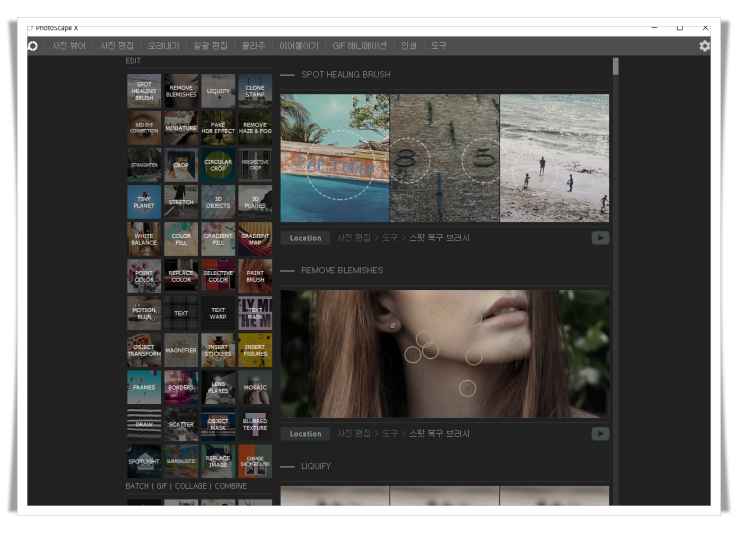 주요 메뉴는 아래와 같으며 제가 자주 사용하는 기능(사진편집/일괄편집/이어붙이기/GIF 애니메이션) 위주로 설명하겠습니다.