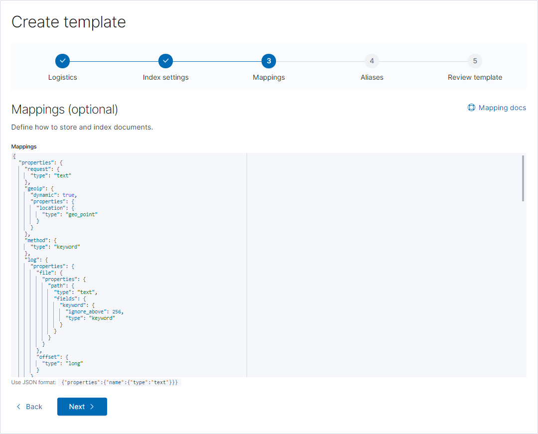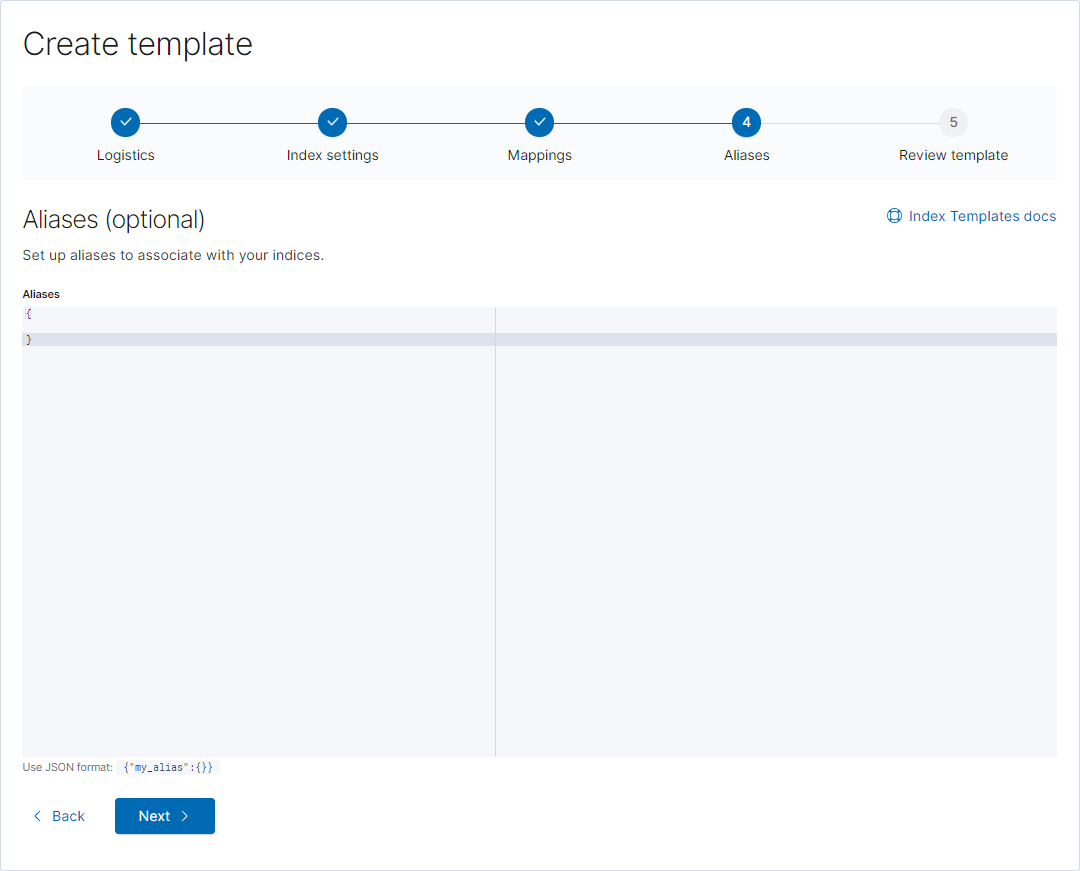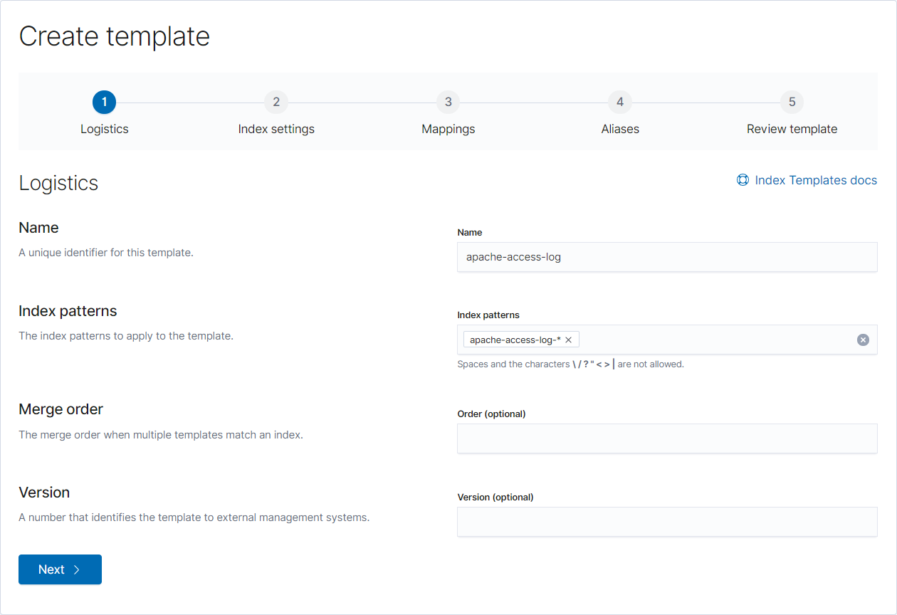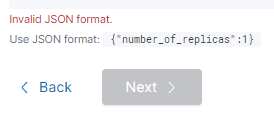 index settings 정보 입력 유효하지 않는 포맷인 경우 붉은색 표기되며, Next 버튼 비활성화
