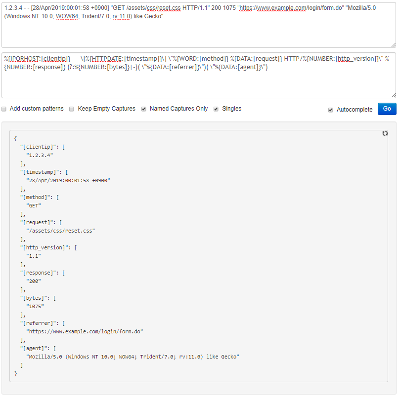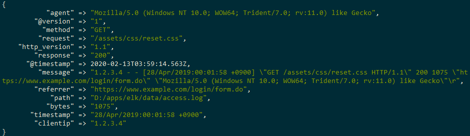 1.2.3.4 - - [28/Apr/2019:00:01:58 +0900] "GET /assets/css/reset.css HTTP/1.1" 200 1075 "https://www.example.com/login/form.do" "Mozilla/5.0 (Windows NT 10.0; WOW64; Trident/7.0; rv:11.0) like Gecko"